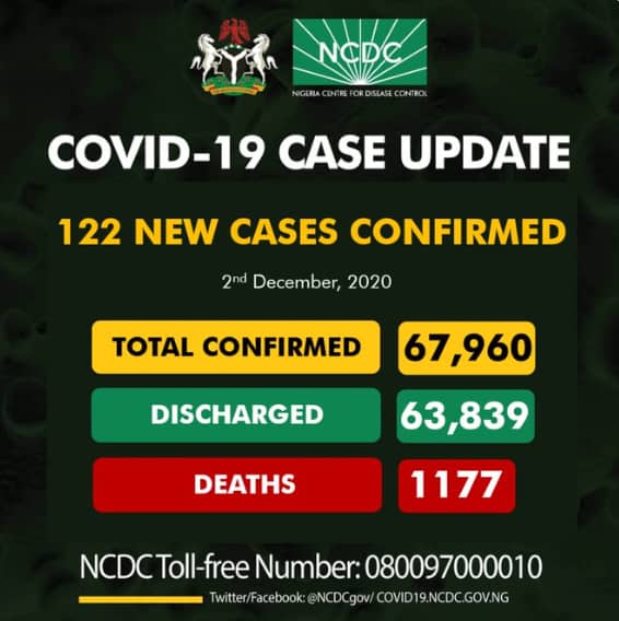 On the 2nd of December 2020, 122 new confirmed cases and 1 death was recorded in Nigeria.