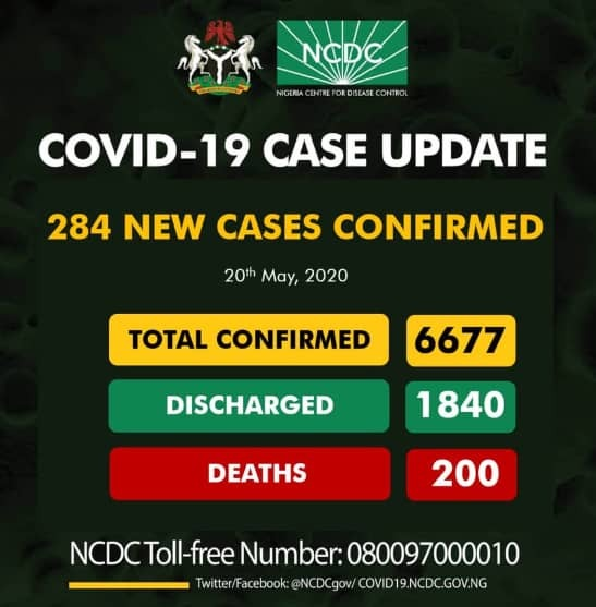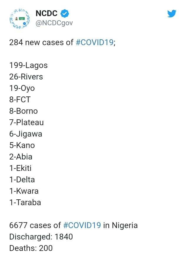 Nigeria has recorded 284 new cases of coronavirus, bringing the total number of confirmed infections in the country to 6,677.