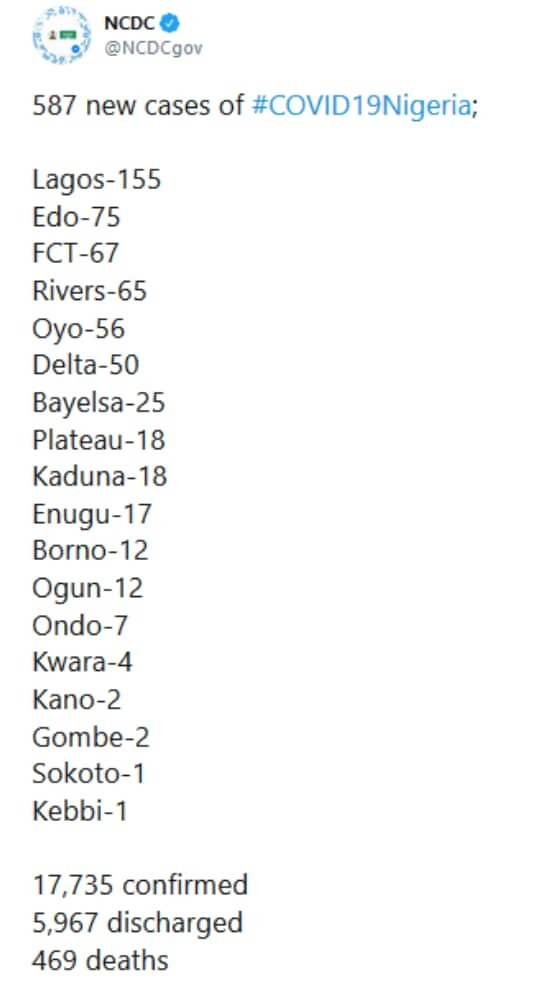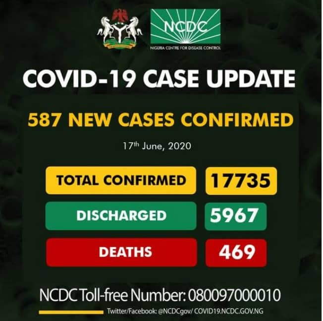 In total, Nigeria has now recorded 17,735 cases of COVID-19. 5,967 patients have been discharged from various Isolation centers across the country, while 469 deaths have been recorded.