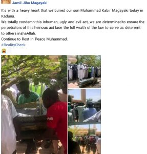 “It’s with a heavy heart that we buried our son Muhammad Kabir Magayaki today in Kaduna. We condemn this inhuman, ugly, and evil act, we are determined to ensure the perpetrators of this heinous act face the full wrath of the law to serve as a deterrent to others inshaAllah. Continue to Rest In Peace Muhammad” he wrote.