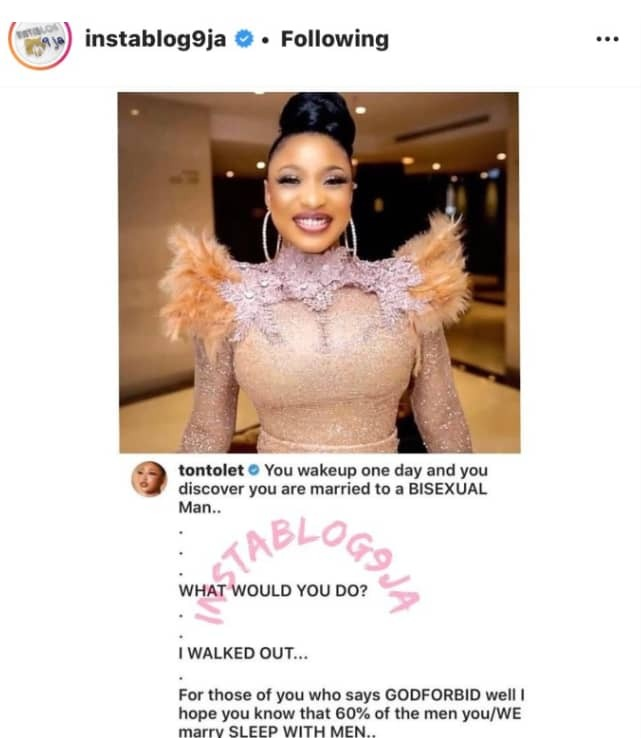 Nollywood actress and philanthropist , Tonto Dikeh has taken to Instagram page to shake tables as she claims 60% of the men in heterosexual marriages have sexual encounters with other men.