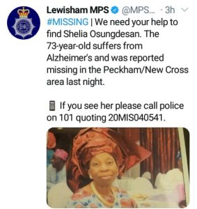 73-year-old Shelia Osungdesan was last seen on Monday night, December 7, in the Peckham/New Cross area of the city.