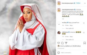 In reaction to the backlash, Toyin Lawani has come out to pay her respect to the attack by giving it a one-minute silence while sharing another photo in a nun outfit.
