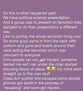 Students and a lecturer of the Adekunle Ajasin University Akungba in Ondo state recently ran for their lives after some of the students in their class came in dressed as terrorists for a presentation they were having on terrorism.