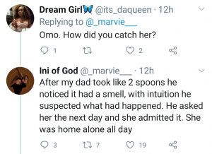 She said the girl, who is yet to turn 10, poured “one of those sniper like chemicals” into her parents’ beverage and her dad noticed the strong smell after taking some spoons.She added that when they girl was questioned, she admitted to it.