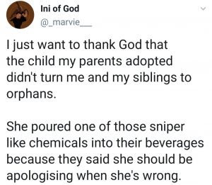 A Twitter user has narrated how a girl her parents adopted tried to poison them.