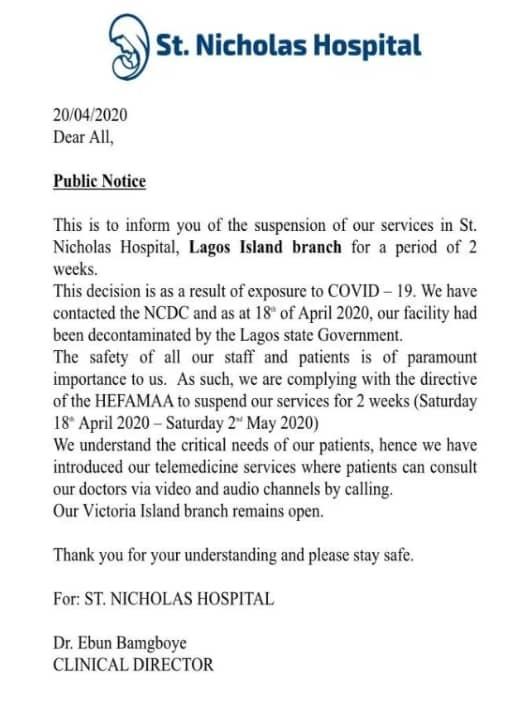 After being exposed to a Coronavirus patient, one of the largest private hospitals in Lagos, St. Nicholas, has shut down its Lagos Island branch for a period of two weeks.