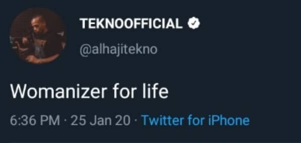 Popular Nigerian singer and producer, Augustine Mile Kelechi is popularly known as Tekno, took to social media to reveal that he is a ‘Womanizer for life’.