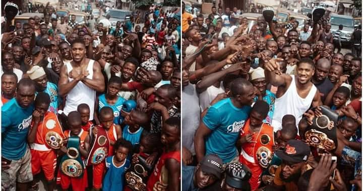 Joshua who is on holiday in Nigeria, posted pictures of himself flanked by fans, including children, who displayed his belts.