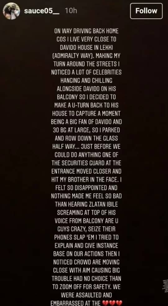 “So I parked and rolled down the glass half way. Just before we could do anything, one of the security guards moved closer and hit my brother in the face. I felt so disappointed and nothing made me feel so bad than hearing Zlatan screaming at the top of his voice from the balcony saying “are you guys crazy. Seize their phones, slap them”.