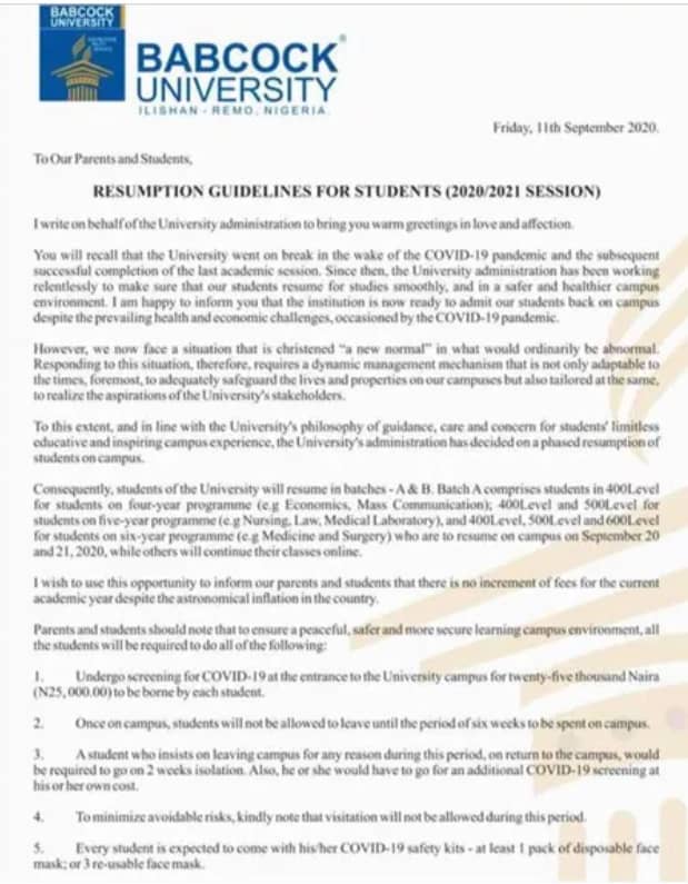 Just like every other higher institutions (private & Governement) in Nigeria, BABCOCK has been on break before the COVID-19 outbreak but now the institution is ready to resume academic activities and it is mandatory for the students to pay the sum of 25K to Undergo COVID19 Tests At The School’s Entrance.