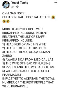 Among the hospital staff abducted was the Head, Clinical Services simply identified as Dr. John, Head of Hematology, Usman Zabbo, and a staff member of the medical lab, Awaisu Bida.