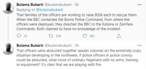 The families of the officers are working to raise 800k each to rescue them. When the BBC contacted the Borno Police Command, from where the officers were deployed, they directed the BBC to the Katsina or Zamfara Commands. Both claimed to not know about the incident.