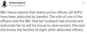 ”BBC Hausa reports that twelve police officers (all ASPs) have been abducted by bandits. The wife of one of the officers told the BBC that her husband had phoned and instructed her to sell his house to raise a ransom. She said she knows the families of eight other abducted officers.