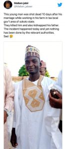 “This young man was shot dead 10 days after his marriage while working on his farm in Isa local gov’t area of Sokoto state. They killed him and also kidnapped his father. The incident happened today and yet nothing has been done by the relevant authorities. Sad,” he tweeted.