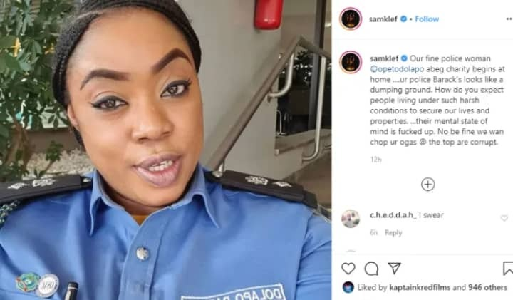 “Our fine policewoman @opetodolapo abeg charity begins at home ….ur police Barack’s looks like a dumping ground. How do u expect people like that to secure our lives and property…their mental state of mind is fucked up. No be fine we wan chop ur ogas @ the top are corrupt