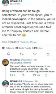 “Lol, small size? Cos he saw my whole body from the car Yh? If I start to list all the experiences, we’ll be here till night. I’m spitting the reality of things, you said I’m victimizing myself. Stop jare.”