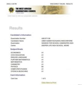The 16-year-old student of Deeper Life High School, Mowe, Ogun State, scored A1 in English Language, Mathematics, Chemistry, Biology, Further Mathematics, Economics, Civic Education, Computer Studies and Dyeing and Bleaching, and a B2 in Physics.