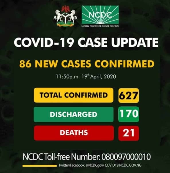 As at 11:50 pm 19th April, there are 627 confirmed cases of COVID-19 reported in Nigeria.