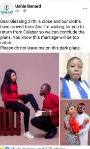 Lamenting his loss, Blessing’s husband-to-be, Bernard Ushie wrote on Facebook: