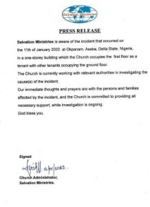 The statement reads, “Salvation Ministry is aware of the incident that occurred on the 11th of January 2022 at Okpanam, Delta State, Nigeria, in a one-storey building, which the church occupies the first floor as a tenant with other tenants occupying the ground floor.
