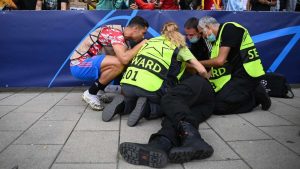 Ronaldo while practicing his shots at goal, miscued one of his efforts horribly, and the ball ended up striking the steward who fell to the ground.