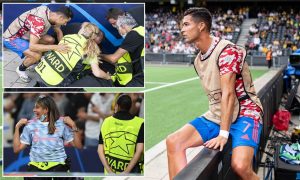 As medical staff checked her Ronaldo walked over to where she was and talked to her.