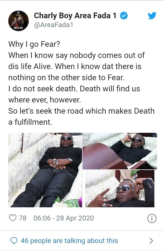 Giving reasons why he snapped in a casket, Charly boy wrote “Why I go Fear? When I know say nobody comes out of dis life Alive. When I know that there is nothing on the other side to Fear. I do not seek death. Death will find us where ever, however. So let’s seek the road which makes death a fulfillment.”