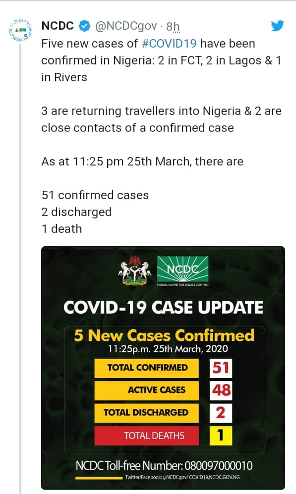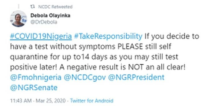 She took to her Twitter handle to pass this message, and her tweet was retweeted by the Nigeria Centre for Disease Control (NCDC).