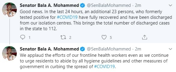 The state governor, Bala Mohammed, who disclosed this via his twitter handle, said so far, 112 patients have been discharged from the state isolation centers.