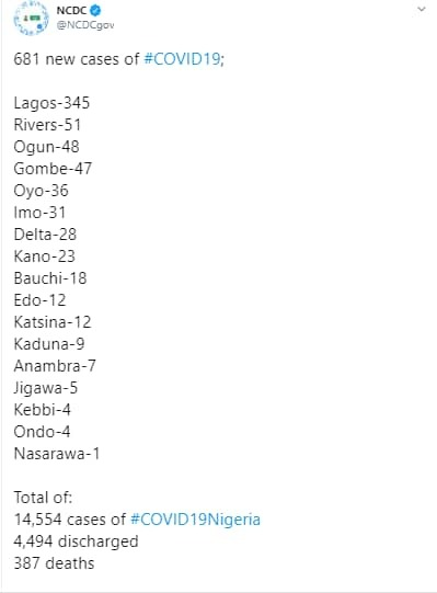 In total, Nigeria has now recorded 14,554 cases of COVID-19. 4,494 patients have been discharged from various Isolation centers across the country, while 387 deaths have been recorded.