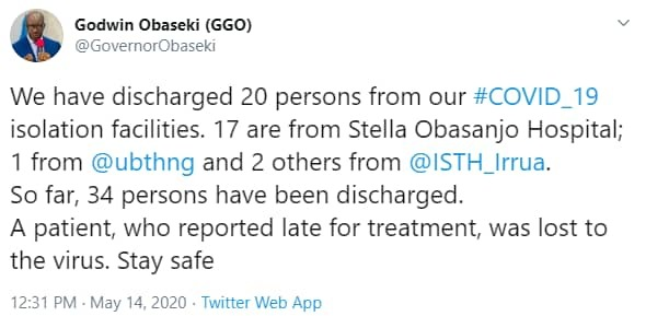 “We have discharged 20 persons from our COVID-19 isolation facilities. 17 are from Stella Obasanjo Hospital; one from the University of Benin Teaching Hospital and two others from Irrua Specialist Teaching Hospital.