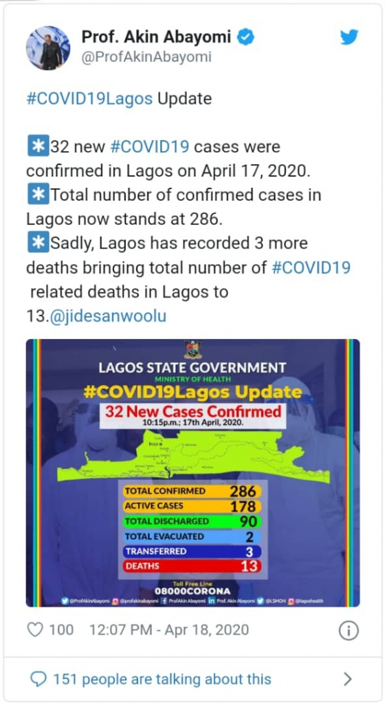 Here’s a tweet that was shared by the commissioner of health, Prof. Akin Abayomi ;