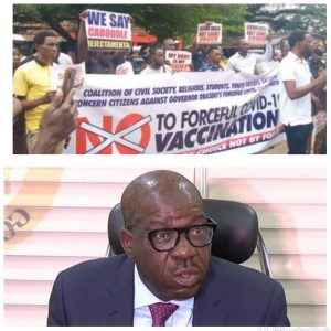 Members of civil society organisations and students on Monday took to major streets in Edo State to protest against the compulsory COVID-19 vaccination policy put in place by the Governor Godwin Obaseki-led administration.
