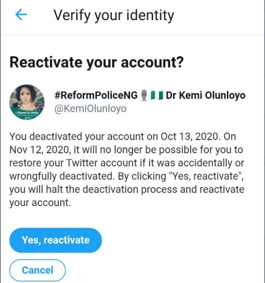 Nigerian youth have been rejoicing hoping Kemi Olunloyo’s account has been suspended for supporting the government over SARS dissolution.