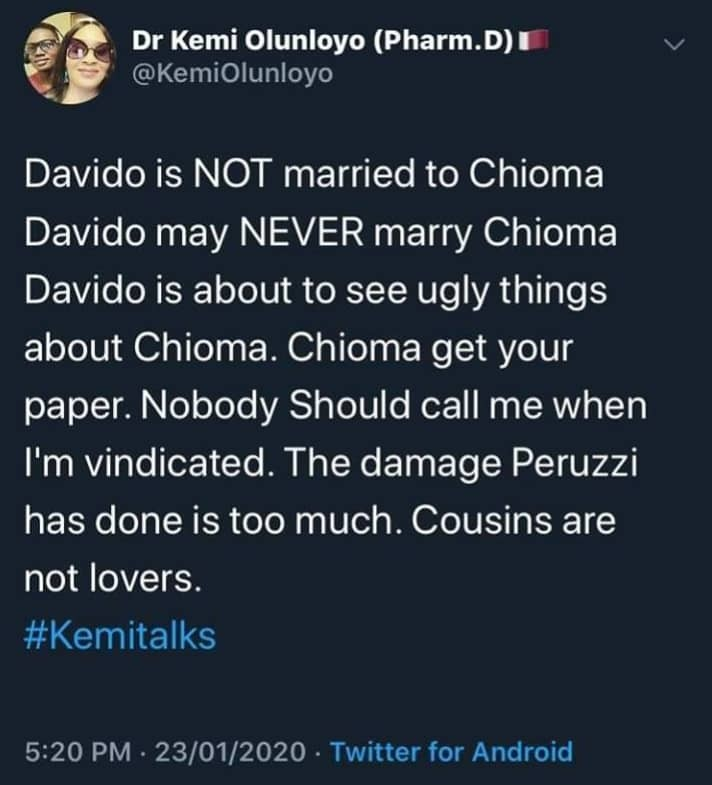 The drama between Davido, Peruzzi, Chioma, King Patrick seems to keep on escalating, controversial Kemi Olunloyo took to social media to add fuel to the already wildfire.