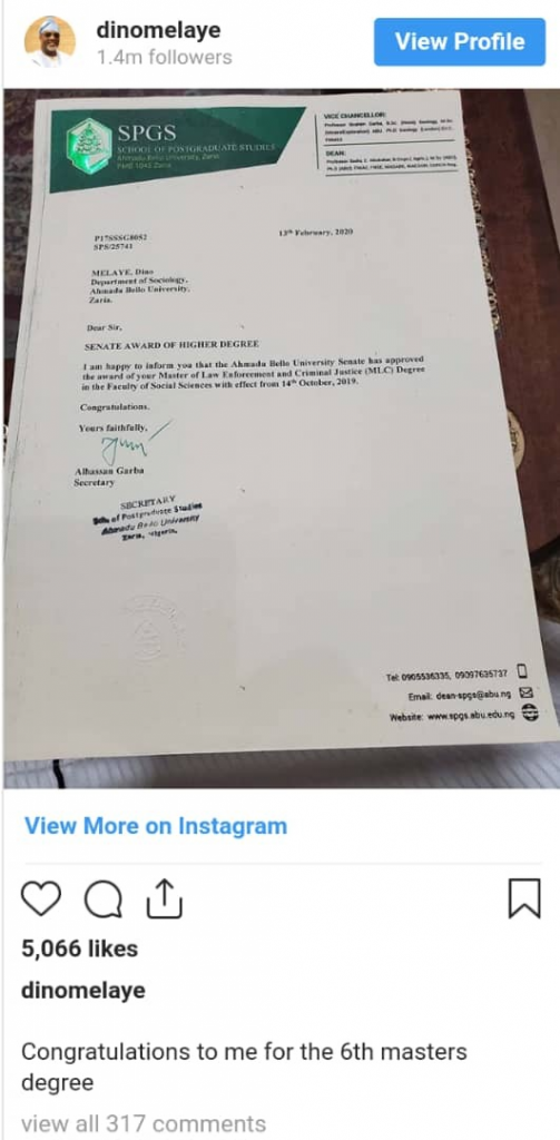 The Kogi-born senator, took to his Instagram page to share a letter approving his master’s degree in Law Enforcement and Criminal Justice from Ahmadu Bello University in Zaria.