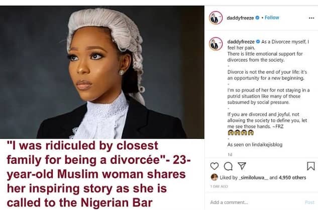 The media personality who said this in reaction to the report of a 23-year-old lady who recounted how she was ridiculed for being a divorcee before being called to bar, stated that divorce is not the end of life but an opportunity for a new beginning.