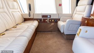 The six-seater aircraft which has a cream leather interior, gold seat buckles, and a fridge is currently in storage at a hangar in New Jersey is 31 years old. The listing has been online since August does not give a price but wants buyers to ‘Call for price. Make an offer,’ if they wish to purchase the aircraft.
