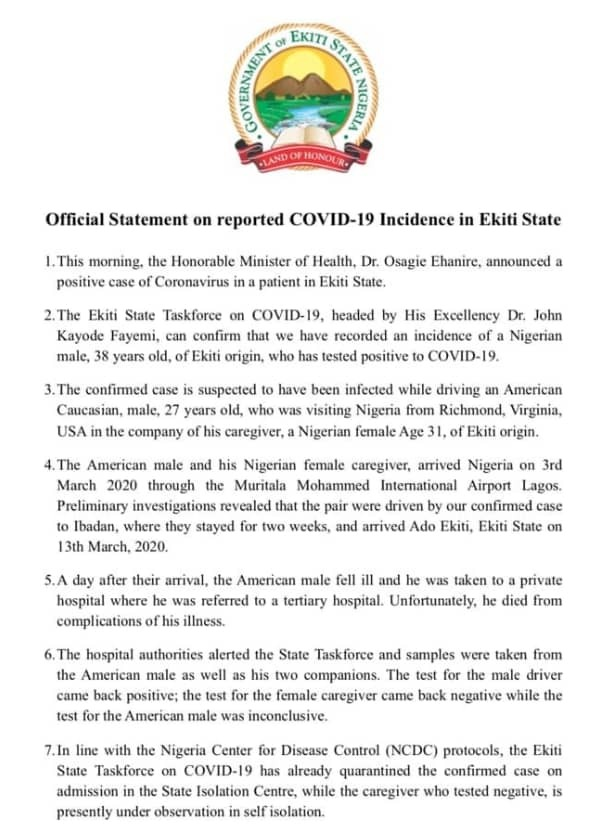 According to her, “The American male and his Nigerian female caregiver, arrived in Nigeria on March 3, 2020, through the Murtala Mohammed International Airport Lagos. Preliminary investigations revealed that the pair were driven by our confirmed case to Ibadan, where they stayed for two weeks and arrived Ado Ekiti, Ekiti State.