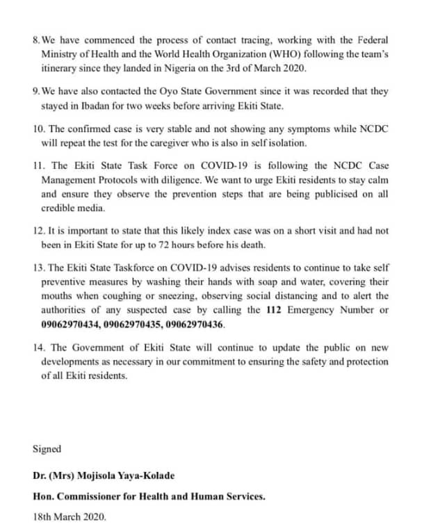 “The Ekiti State Taskforce on Covid-19 advises residents to continue to take self preventive measures by washing their hands with soap and water, covering their mouth when coughing or sneezing, observing social distancing and to alert the authorities of any suspected case by calling the 112 Emergency Number or 09062970434, 09062970435, 09062970436.