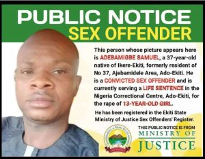 In furtherance of the Ekiti State Government’s naming and shaming of convicted s*x offenders policy, the state’s Ministry of Justice, on Sunday, January 30, publicly published the identity of a convicted sex offender, Samuel Adebamigbe.