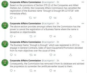 It tweeted, “Based on the provisions of Section 579 (2) of the Companies and Allied Matters Act, the Corporate Affairs Commission has cancelled the registration of the business name ‘Enough is Enough BN 2210728’ with immediate effect.