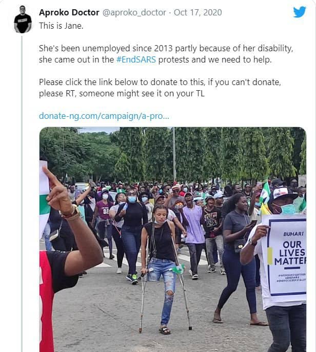Despite living with just a limb, this did not deter her from joining the ongoing anti-SARS protest. A photo of Jane at the protest walk surfaced online, leaving many people in awe and some, inspired.