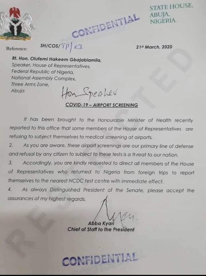 In a leaked memo dated March 21, 2020, addressed to Speaker of the House of Representatives, Femi Gbajabiamila, Kyari expressed displeasure at the refusal of legislators to undergo Coronavirus checks at the country’s airports upon arriving Nigeria.