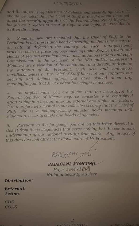 Consequently, Mr. Monguno has fired a warning memo to all service chiefs to desist from taking further directives from Mr. Kyari, according to documents seen by our correspondent.