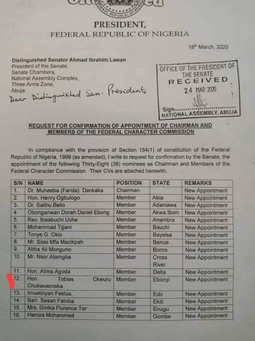 The appointment of the late Okwuru alongside 37 others was contained in a letter Buhari sent to the Nigerian Senate for confirmation.