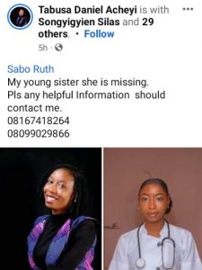 Sabo Ruth Hunu, a 21-year-old Nigerian lady, has gone missing.