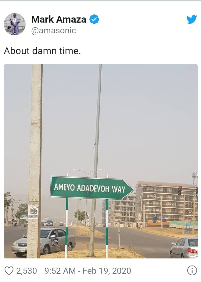 The road is located along Ahmadu Bello Way, close to the Nigerian Air Force Conference Centre, According to the Cable, the road will now be known as Ameyo Adadevoh Way.