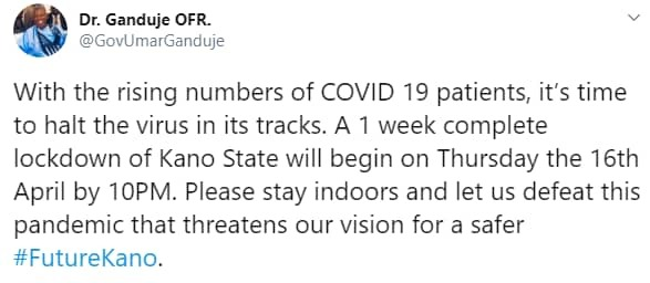 The state governor, Abdullahi Umar, announced a one-week lockdown in the state to prevent the spread of the virus.